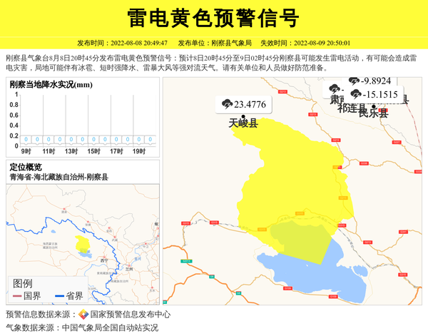 刚察县气象台8月8日20时45分发布雷电黄色预警信号:预计8日20时45分至9日02时45分刚察县可能发生雷电活动,有可能会造成雷电灾害,局地可能伴有冰雹、短时强降水、雷暴大风等强对流天气。请有关单位和人员做好防范准备。 信息来源:国家预警信息发布中心; 发布单位:刚察县气象局。