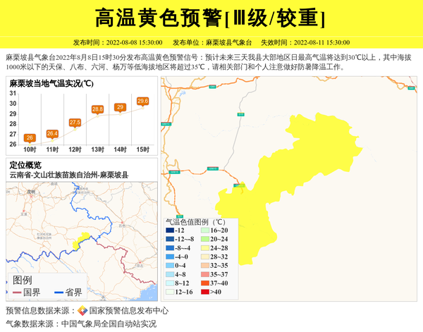 麻栗坡县气象台2022年8月8日15时30分发布高温黄色预警信号:预计未来三天我县大部地区日最高气温将达到30℃以上,其中海拔1000米以下的天保、八布、六河、杨万等低海拔地区将超过35℃,请相关部门和个人注意做好防暑降温工作。 信息来源:国家预警信息发布中心; 发布单位:麻栗坡县气象台。