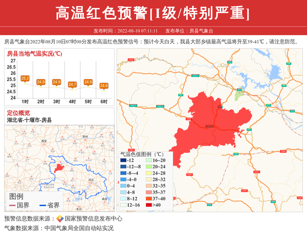 房县气象台2022年08月10日07时08分发布高温红色预警信号:预计今天白天,我县大部乡镇最高气温将升至39-41℃,请注意防范。 信息来源:国家预警信息发布中心; 发布单位:房县气象台。