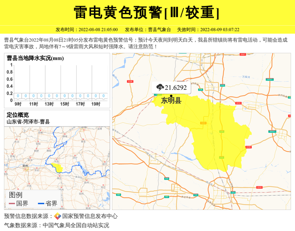 曹县气象台2022年08月08日21时05分发布雷电黄色预警信号:预计今天夜间到明天白天,我县所辖镇街将有雷电活动,可能会造成雷电灾害事故,局地伴有7~9级雷雨大风和短时强降水。请注意防范! 信息来源:国家预警信息发布中心; 发布单位:曹县气象台。