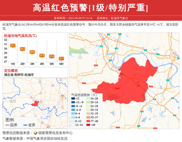 松滋市气象台2022年08月09日07时09分发布高温红色预警信号:预计今天白天,我市大部乡镇最高气温将升至39℃~41℃,请注意防范。 信息来源:国家预警信息发布中心; 发布单位:松滋市气象台。