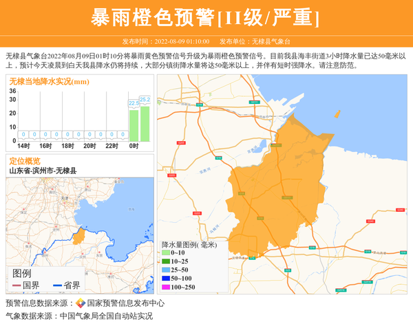 无棣县气象台2022年08月09日01时10分将暴雨黄色预警信号升级为暴雨橙色预警信号。目前我县海丰街道3小时降水量已达50毫米以上,预计今天凌晨到白天我县降水仍将持续,大部分镇街降水量将达50毫米以上,并伴有短时强降水。请注意防范。 信息来源:国家预警信息发布中心; 发布单位:无棣县气象台。