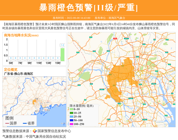 【南海区暴雨橙色预警】预计未来3小时我区狮山强降雨持续,南海区气象台2022年8月8日16时40分发布狮山暴雨橙色预警信号,同时其余镇街暴雨黄色和全区雷雨大风黄色预警信号正在生效中,请注意防御暴雨可能引发的城镇内涝、山体滑坡等灾害。 信息来源:国家预警信息发布中心; 发布单位:南海区气象台。