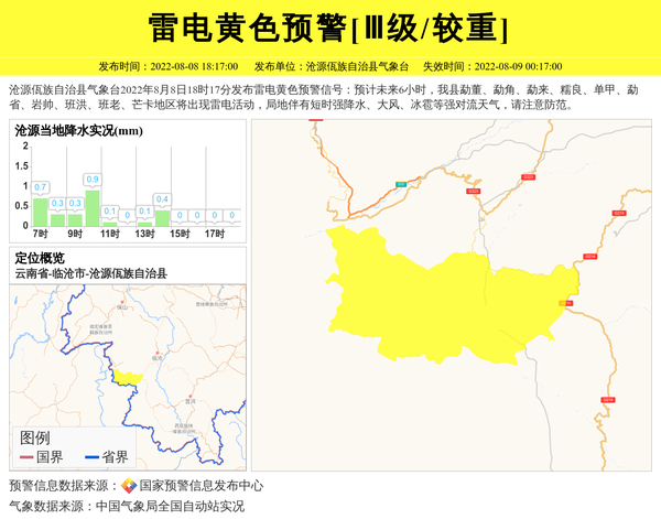 沧源佤族自治县气象台2022年8月8日18时17分发布雷电黄色预警信号:预计未来6小时,我县勐董、勐角、勐来、糯良、单甲、勐省、岩帅、班洪、班老、芒卡地区将出现雷电活动,局地伴有短时强降水、大风、冰雹等强对流天气,请注意防范。 信息来源:国家预警信息发布中心; 发布单位:沧源佤族自治县气象台。
