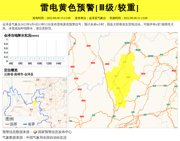 会泽县气象台2022年8月8日15时12分发布雷电黄色预警信号:预计未来6小时,我县大部将发生雷电活动,可能伴有6至7级阵性大风、冰雹或短时强降水,请注意防范。 信息来源:国家预警信息发布中心; 发布单位:会泽县气象台。