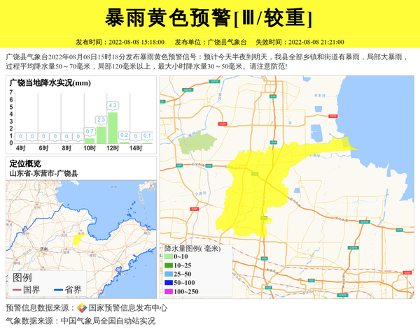 广饶县气象台2022年08月08日15时18分发布暴雨黄色预警信号:预计今天半夜到明天,我县全部乡镇和街道有暴雨,局部大暴雨,过程平均降水量50~70毫米,局部120毫米以上,最大小时降水量30~50毫米。请注意防范! 信息来源:国家预警信息发布中心; 发布单位:广饶县气象台。