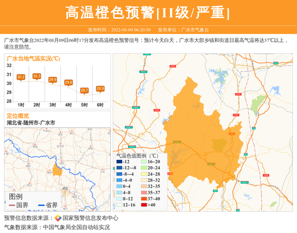 广水市气象台2022年08月09日06时17分发布高温橙色预警信号:预计今天白天,广水市大部乡镇和街道日最高气温将达37℃以上,请注意防范。 信息来源:国家预警信息发布中心; 发布单位:广水市气象台。