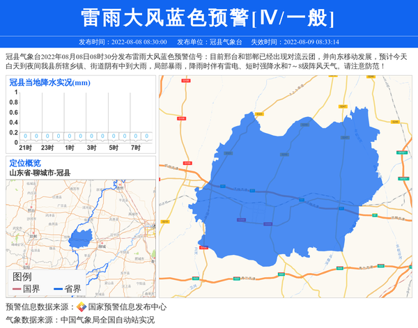 冠县气象台2022年08月08日08时30分发布雷雨大风蓝色预警信号:目前邢台和邯郸已经出现对流云团,并向东移动发展,预计今天白天到夜间我县所辖乡镇、街道阴有中到大雨,局部暴雨,降雨时伴有雷电、短时强降水和7~8级阵风天气。请注意防范! 信息来源:国家预警信息发布中心; 发布单位:冠县气象台。