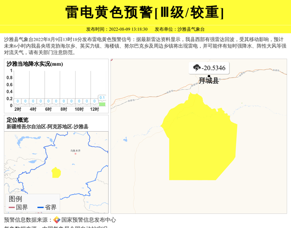 沙雅县气象台2022年8月9日13时18分发布雷电黄色预警信号:据最新雷达资料显示,我县西部有强雷达回波,受其移动影响,预计未来6小时内我县央塔克协海尔乡、英买力镇、海楼镇、努尔巴克乡及周边乡镇将出现雷电,并可能伴有短时强降水、阵性大风等强对流天气,请有关部门注意防范。 信息来源:国家预警信息发布中心; 发布单位:沙雅县气象台。