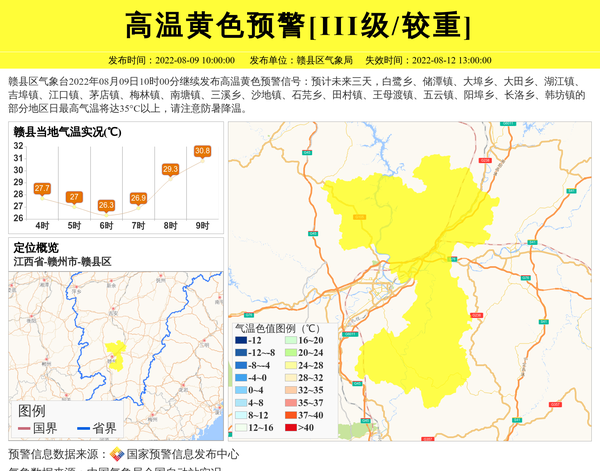 赣县区气象台2022年08月09日10时00分继续发布高温黄色预警信号:预计未来三天,白鹭乡、储潭镇、大埠乡、大田乡、湖江镇、吉埠镇、江口镇、茅店镇、梅林镇、南塘镇、三溪乡、沙地镇、石芫乡、田村镇、王母渡镇、五云镇、阳埠乡、长洛乡、韩坊镇的部分地区日最高气温将达35°C以上,请注意防暑降温。 信息来源:国家预警信息发布中心; 发布单位:赣县区气象局。