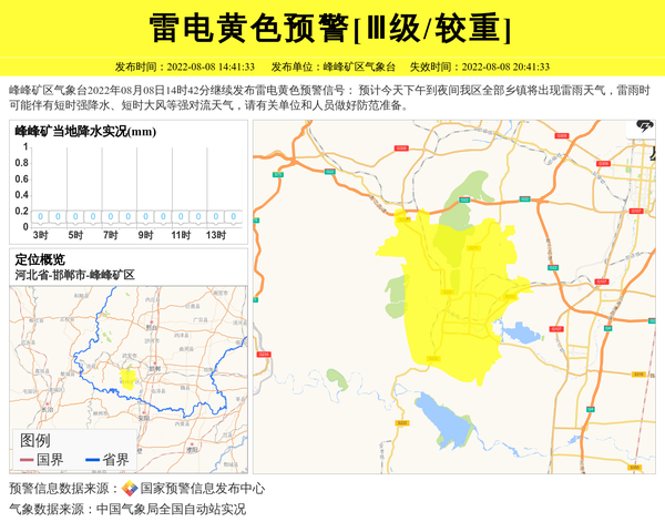 峰峰矿区气象台2022年08月08日14时42分继续发布雷电黄色预警信号: 预计今天下午到夜间我区全部乡镇将出现雷雨天气,雷雨时可能伴有短时强降水、短时大风等强对流天气,请有关单位和人员做好防范准备。 信息来源:国家预警信息发布中心; 发布单位:峰峰矿区气象台。