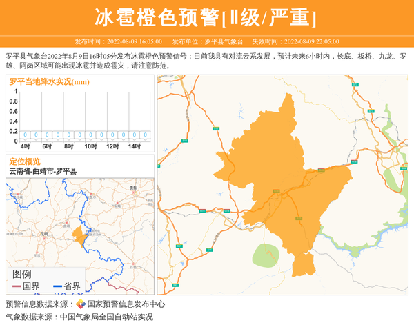 罗平县气象台2022年8月9日16时05分发布冰雹橙色预警信号:目前我县有对流云系发展,预计未来6小时内,长底、板桥、九龙、罗雄、阿岗区域可能出现冰雹并造成雹灾,请注意防范。 信息来源:国家预警信息发布中心; 发布单位:罗平县气象台。