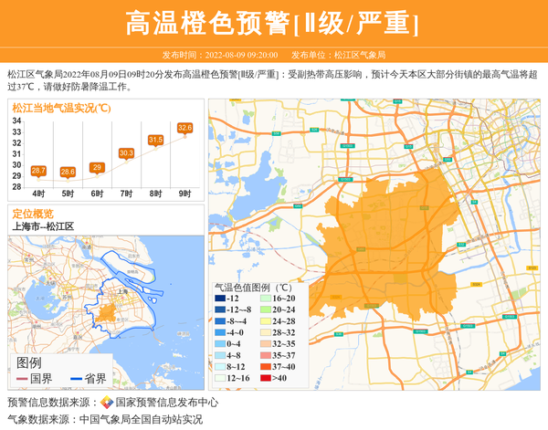 松江区气象局2022年08月09日09时20分发布高温橙色预警[Ⅱ级/严重]:受副热带高压影响,预计今天本区大部分街镇的最高气温将超过37℃,请做好防暑降温工作。 信息来源:国家预警信息发布中心; 发布单位:松江区气象局。