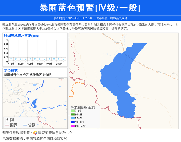 叶城县气象台2022年8月10日0时26分发布暴雨蓝色预警信号:目前叶城县棋盘乡阿托什鲁克已出现14.3毫米的大雨,预计未来12小时内叶城县山区乡镇将出现大于24.1毫米以上的降水,地质气象灾害风险等级较高,请注意防范。 信息来源:国家预警信息发布中心; 发布单位:叶城县气象台。