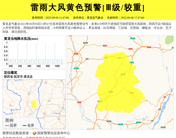 黄龙县气象台2022年08月08日11时47分发布雷雨大风黄色预警信号:未来6小时内下述地区可能受雷雨大风影响,阵风可达7级或以上并伴有雷电,局地短时暴雨或冰雹,小时雨量可达10毫米以上:界头庙镇、白马滩镇、三岔镇、石堡镇、崾崄乡、圪台乡、瓦子街镇,请注意防范。 信息来源:国家预警信息发布中心; 发布单位:黄龙县气象台。