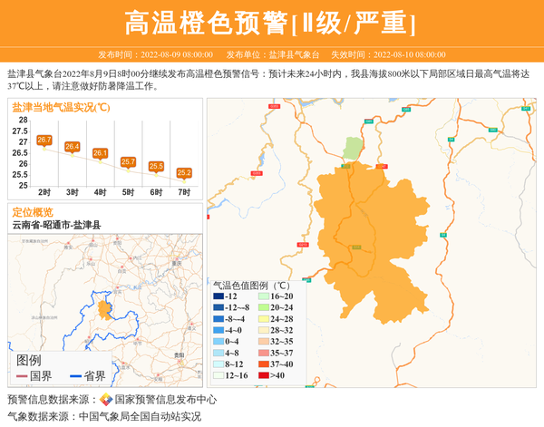盐津县气象台2022年8月9日8时00分继续发布高温橙色预警信号:预计未来24小时内,我县海拔800米以下局部区域日最高气温将达37℃以上,请注意做好防暑降温工作。 信息来源:国家预警信息发布中心; 发布单位:盐津县气象台。