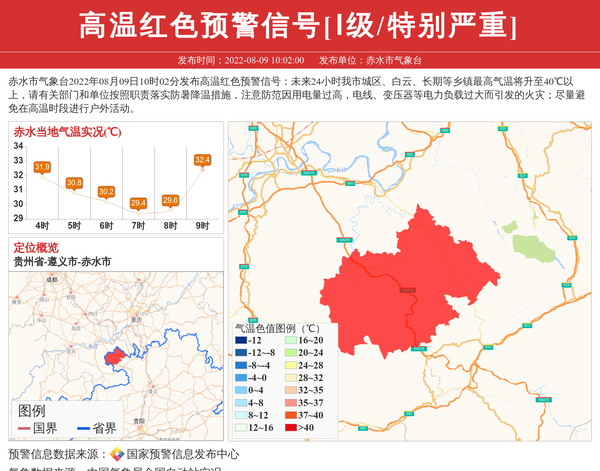 赤水市气象台2022年08月09日10时02分发布高温红色预警信号:未来24小时我市城区、白云、长期等乡镇最高气温将升至40℃以上,请有关部门和单位按照职责落实防暑降温措施,注意防范因用电量过高,电线、变压器等电力负载过大而引发的火灾;尽量避免在高温时段进行户外活动。 信息来源:国家预警信息发布中心; 发布单位:赤水市气象台。