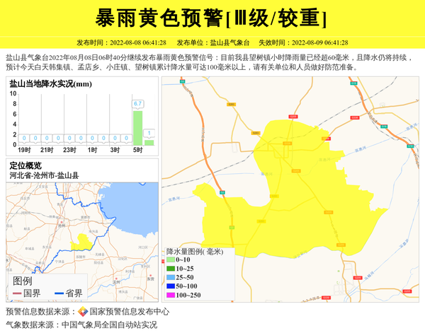 盐山县气象台2022年08月08日06时40分继续发布暴雨黄色预警信号:目前我县望树镇小时降雨量已经超60毫米,且降水仍将持续,预计今天白天韩集镇、孟店乡、小庄镇、望树镇累计降水量可达100毫米以上,请有关单位和人员做好防范准备。 信息来源:国家预警信息发布中心; 发布单位:盐山县气象台。