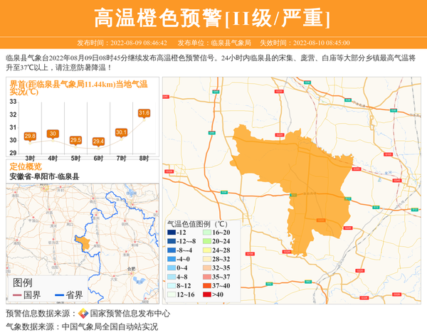 临泉县气象台2022年08月09日08时45分继续发布高温橙色预警信号。24小时内临泉县的宋集、庞营、白庙等大部分乡镇最高气温将升至37℃以上,请注意防暑降温! 信息来源:国家预警信息发布中心; 发布单位:临泉县气象局。