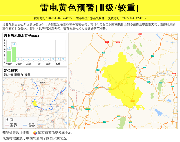 涉县气象台2022年08月09日06时41分继续发布雷电黄色预警信号:预计今天白天到夜间我县全部乡镇将出现雷雨天气,雷雨时局地将伴有短时强降水、短时大风等强对流天气。请有关单位和人员做好防范准备。 信息来源:国家预警信息发布中心; 发布单位:涉县气象台。