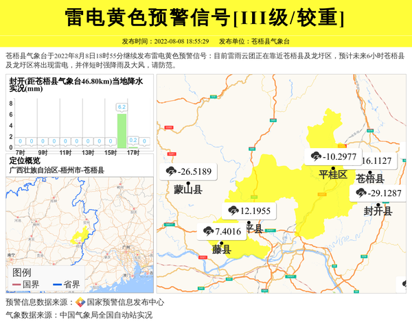 苍梧县气象台于2022年8月8日18时55分继续发布雷电黄色预警信号:目前雷雨云团正在靠近苍梧县及龙圩区,预计未来6小时苍梧县及龙圩区将出现雷电,并伴短时强降雨及大风,请防范。 信息来源:国家预警信息发布中心; 发布单位:苍梧县气象台。