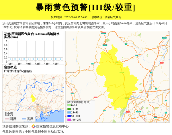 预计受清城方向雷雨云团影响,未来2~3小时内,我区自南向北将出现强降水,最大小时雨量30-40毫米,清新区气象台于08月08日17时18分发布清新区暴雨黄色预警信号,请注意防御强降水及其引发的次生灾害。 信息来源:国家预警信息发布中心; 发布单位:清新区气象台。
