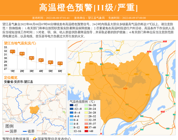 望江县气象台2022年08月08日07时00分继续发布高温橙色预警信号。24小时内我县大部分乡镇最高气温仍将达37℃以上。请注意防范! 防御指南: 1.有关部门和单位按照职责落实防暑降温保障措施; 2.尽量避免在高温时段进行户外活动,高温条件下作业的人员应当缩短连续工作时间; 3.对老、弱、病、幼人群提供防暑降温指导,并采取必要的防护措施; 4.有关部门和单位应当注意防范因用电量过高,以及电线、变压器等电力负载过大而引发的火灾。 信息来源:国家预警信息发布中心; 发布单位:望江县气象局。