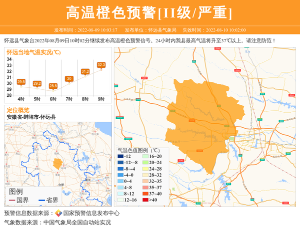 怀远县气象台2022年08月09日10时02分继续发布高温橙色预警信号。24小时内我县最高气温将升至37℃以上。请注意防范! 信息来源:国家预警信息发布中心; 发布单位:怀远县气象局。