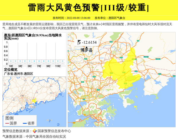 受局地生成且不断发展的雷雨云团影响,我区已出现雷雨天气,预计未来6小时我区雷雨频繁,并伴有雷电和短时大风等强对流天气,惠阳区气象台8日13时03分发布雷雨大风黄色预警信号,请注意防御。 信息来源:国家预警信息发布中心; 发布单位:惠阳区气象台。