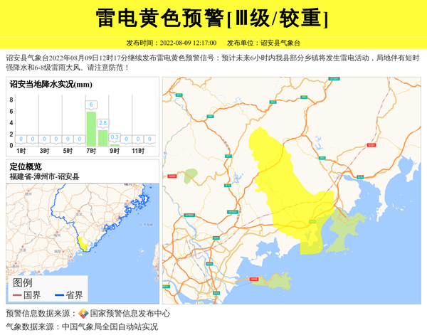 诏安县气象台2022年08月09日12时17分继续发布雷电黄色预警信号:预计未来6小时内我县部分乡镇将发生雷电活动,局地伴有短时强降水和6-8级雷雨大风。请注意防范! 信息来源:国家预警信息发布中心; 发布单位:诏安县气象台。