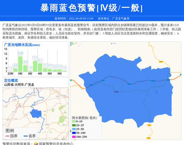 广灵县气象台2022年8月9日08时55分变更发布暴雨蓝色预警信号:目前预警区域内部分乡镇降雨量已经超过50毫米,预计未来12小时内降雨仍将持续,预警区域:所有乡、镇(街道)。 防御指南: 1.政府及相关部门按照职责做好防暴雨准备工作; 2.学校、幼儿园采取适当措施,保证学生和幼儿安全;人员应当留在室内,并关好门窗; 3.驾驶人员应当注意道路积水和交通阻塞,确保安全; 4.检查城市、农田、鱼塘排水系统,做好排涝准备。 信息来源:国家预警信息发布中心; 发布单位:广灵县气象局。
