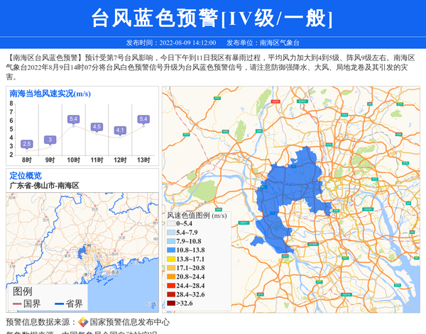 【南海区台风蓝色预警】预计受第7号台风影响,今日下午到11日我区有暴雨过程,平均风力加大到4到5级、阵风9级左右。南海区气象台2022年8月9日14时07分将台风白色预警信号升级为台风蓝色预警信号,请注意防御强降水、大风、局地龙卷及其引发的灾害。 信息来源:国家预警信息发布中心; 发布单位:南海区气象台。