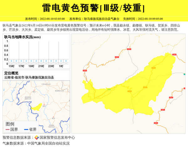 耿马县气象台2022年8月10日03时05分发布雷电黄色预警信号:预计未来6小时,我县勐永镇、勐撒镇、耿马镇、贺派乡、四排山乡、芒洪乡、大兴乡、孟定镇、勐简乡等乡镇将出现雷电活动,局地伴有短时强降水、冰雹、大风等强对流天气,请注意防范。 信息来源:国家预警信息发布中心; 发布单位:耿马傣族佤族自治县气象台。