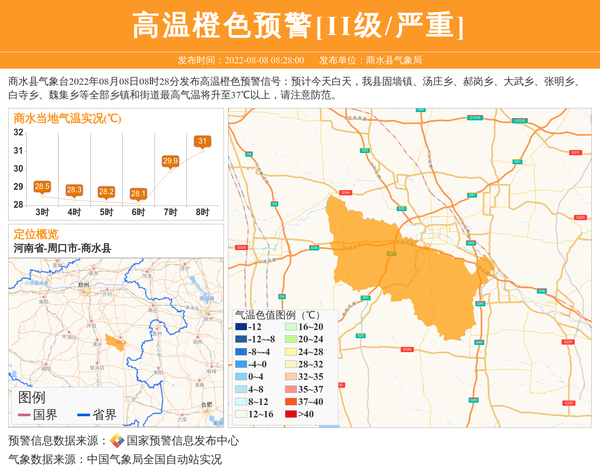 商水县气象台2022年08月08日08时28分发布高温橙色预警信号:预计今天白天,我县固墙镇、汤庄乡、郝岗乡、大武乡、张明乡、白寺乡、魏集乡等全部乡镇和街道最高气温将升至37℃以上,请注意防范。 信息来源:国家预警信息发布中心; 发布单位:商水县气象局。