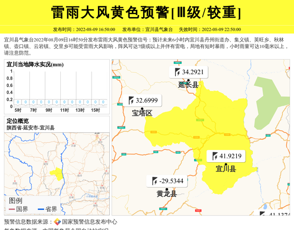 宜川县气象台2022年08月09日16时50分发布雷雨大风黄色预警信号:预计未来6小时内宜川县丹州街道办、集义镇、英旺乡、秋林镇、壶口镇、云岩镇、交里乡可能受雷雨大风影响,阵风可达7级或以上并伴有雷电,局地有短时暴雨,小时雨量可达10毫米以上,请注意防范。 信息来源:国家预警信息发布中心; 发布单位:宜川县气象台。