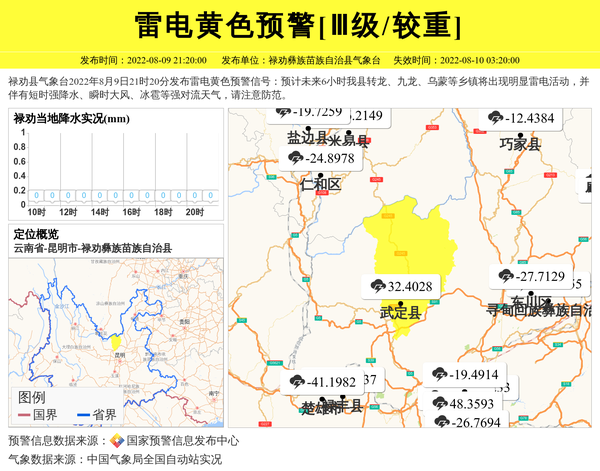 禄劝县气象台2022年8月9日21时20分发布雷电黄色预警信号:预计未来6小时我县转龙、九龙、乌蒙等乡镇将出现明显雷电活动,并伴有短时强降水、瞬时大风、冰雹等强对流天气,请注意防范。 信息来源:国家预警信息发布中心; 发布单位:禄劝彝族苗族自治县气象台。