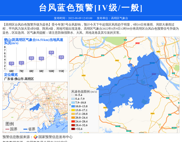 【高明区台风白色预警升级为蓝色】受今年第7号台风影响,预计今天下午起我区风雨趋于明显,9到10日有暴雨、局部大暴雨过程,平均风力加大至4到5级、阵风9级,局地可能出现龙卷。高明区气象台2022年8月9日12时00分将高明区台风白色预警信号升级为蓝色,区应急局、区气象局提醒:请注意防御强降水、大风、局地龙卷及其引发的灾害。 信息来源:国家预警信息发布中心; 发布单位:高明区气象台。