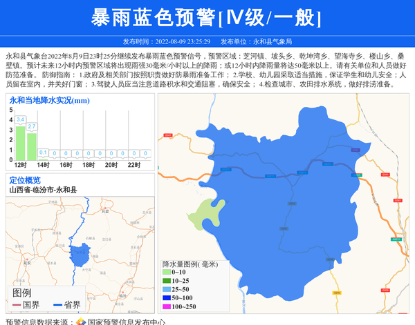 永和县气象台2022年8月9日23时25分继续发布暴雨蓝色预警信号,预警区域:芝河镇、坡头乡、乾坤湾乡、望海寺乡、楼山乡、桑壁镇。预计未来12小时内预警区域将出现雨强30毫米/小时以上的降雨;或12小时内降雨量将达50毫米以上。请有关单位和人员做好防范准备。 防御指南: 1.政府及相关部门按照职责做好防暴雨准备工作; 2.学校、幼儿园采取适当措施,保证学生和幼儿安全;人员留在室内,并关好门窗; 3.驾驶人员应当注意道路积水和交通阻塞,确保安全; 4.检查城市、农田排水系统,做好排涝准备。 信息来源:国家预警信息发布中心; 发布单位:永和县气象局。