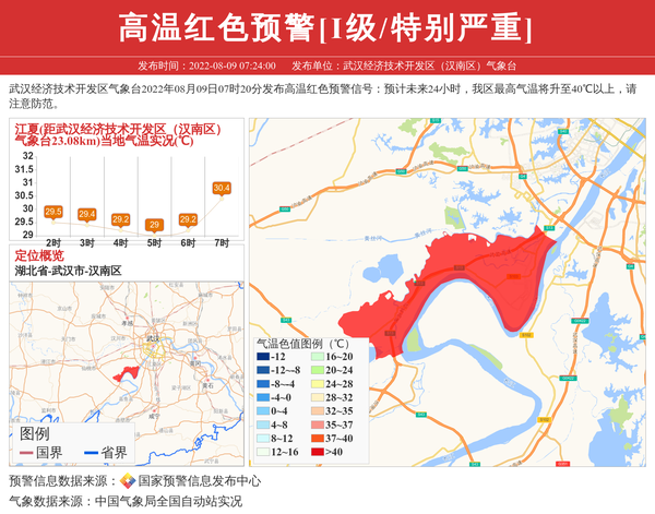 武汉经济技术开发区气象台2022年08月09日07时20分发布高温红色预警信号:预计未来24小时,我区最高气温将升至40℃以上,请注意防范。 信息来源:国家预警信息发布中心; 发布单位:武汉经济技术开发区(汉南区)气象台。