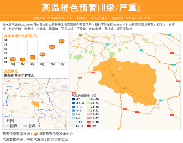柞水县气象台2022年08月09日11时32分升级发布高温橙色预警信号:预计下述地区未来24小时内最高气温将升至37℃以上:杏坪镇、红岩寺镇、营盘镇、小岭镇、凤凰镇、瓦房口镇、下梁镇、乾佑街道、曹坪镇,请注意防范。 信息来源:国家预警信息发布中心; 发布单位:柞水县气象台。