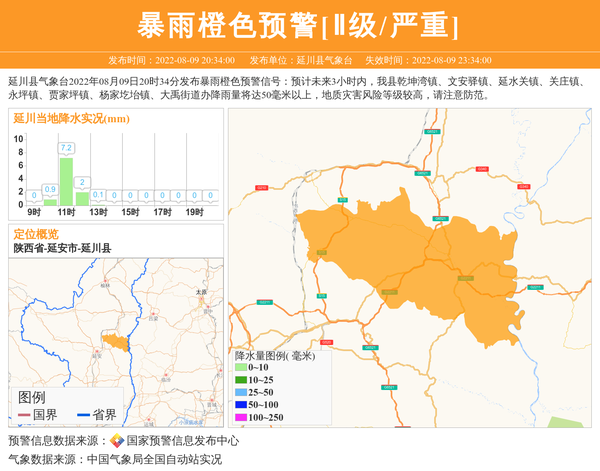 延川县气象台2022年08月09日20时34分发布暴雨橙色预警信号:预计未来3小时内,我县乾坤湾镇、文安驿镇、延水关镇、关庄镇、永坪镇、贾家坪镇、杨家圪坮镇、大禹街道办降雨量将达50毫米以上,地质灾害风险等级较高,请注意防范。 信息来源:国家预警信息发布中心; 发布单位:延川县气象台。