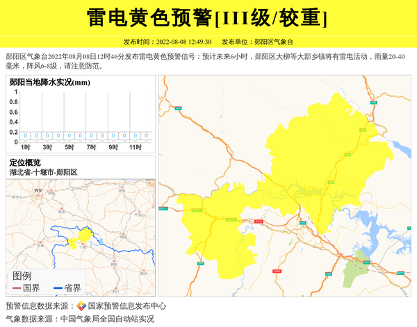 郧阳区气象台2022年08月08日12时46分发布雷电黄色预警信号:预计未来6小时,郧阳区大柳等大部乡镇将有雷电活动,雨量20-40毫米,阵风6-8级,请注意防范。 信息来源:国家预警信息发布中心; 发布单位:郧阳区气象台。