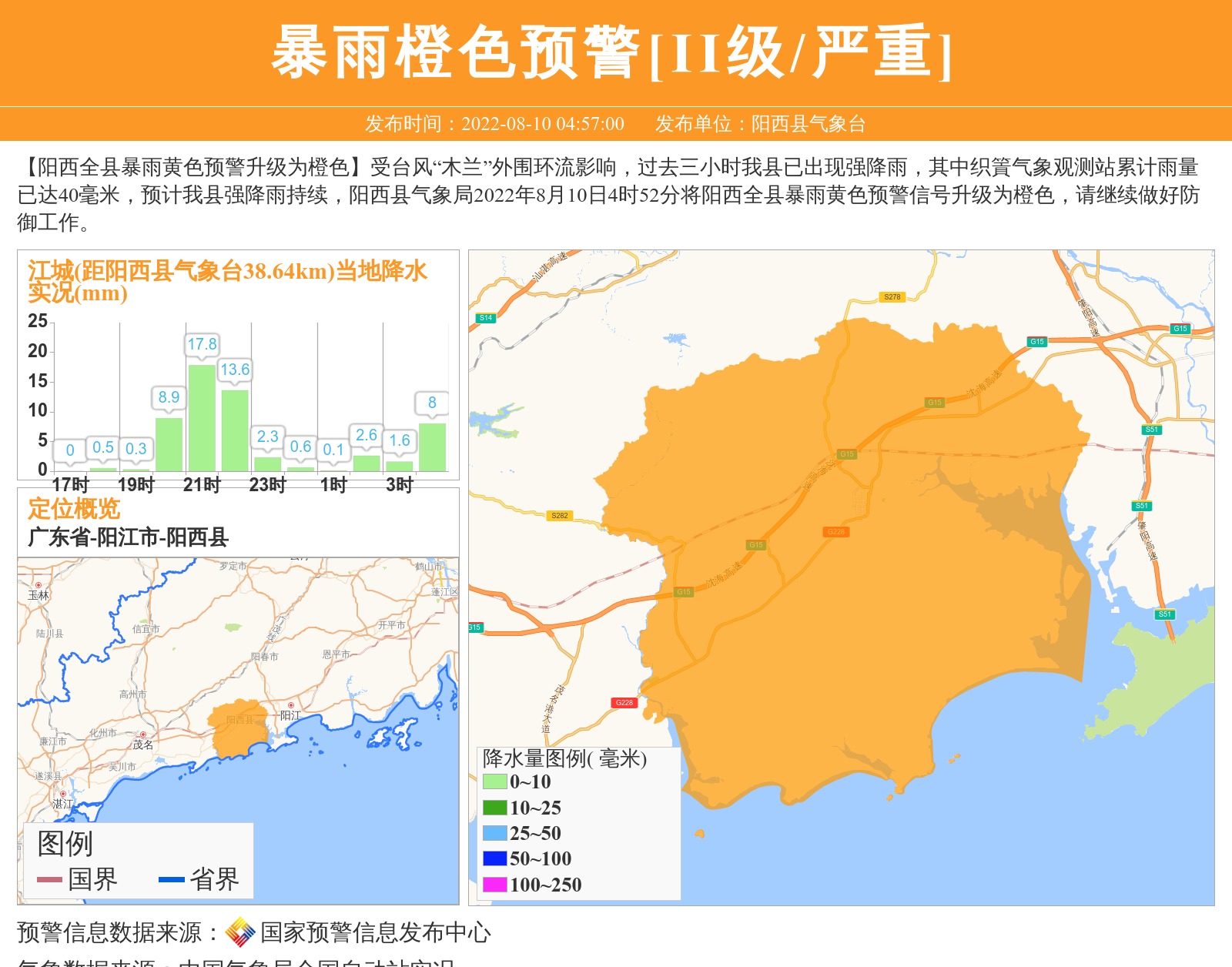 【阳西全县暴雨黄色预警升级为橙色】受台风“木兰”外围环流影响,过去三小时我县已出现强降雨,其中织篢气象观测站累计雨量已达40毫米,预计我县强降雨持续,阳西县气象局2022年8月10日4时52分将阳西全县暴雨黄色预警信号升级为橙色,请继续做好防御工作。 信息来源:国家预警信息发布中心; 发布单位:阳西县气象台。