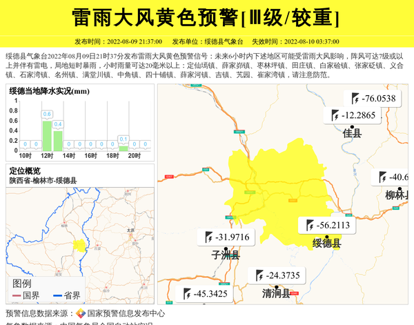 绥德县气象台2022年08月09日21时37分发布雷雨大风黄色预警信号:未来6小时内下述地区可能受雷雨大风影响,阵风可达7级或以上并伴有雷电,局地短时暴雨,小时雨量可达20毫米以上:定仙墕镇、薛家峁镇、枣林坪镇、田庄镇、白家硷镇、张家砭镇、义合镇、石家湾镇、名州镇、满堂川镇、中角镇、四十铺镇、薛家河镇、吉镇、艽园、崔家湾镇,请注意防范。 信息来源:国家预警信息发布中心; 发布单位:绥德县气象台。