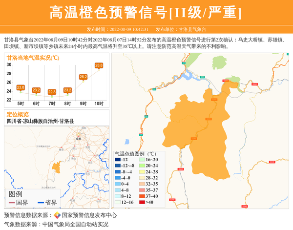 甘洛县气象台2022年08月09日10时42分对2022年08月07日14时52分发布的高温橙色预警信号进行第2次确认:乌史大桥镇、苏雄镇、田坝镇、新市坝镇等乡镇未来24小时内最高气温将升至38℃以上。请注意防范高温天气带来的不利影响。 信息来源:国家预警信息发布中心; 发布单位:甘洛县气象台。