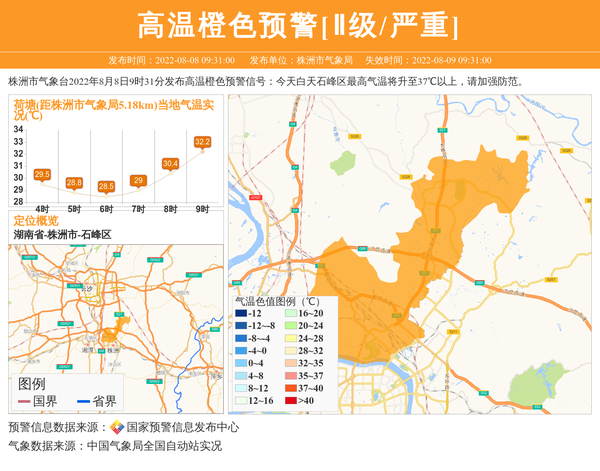 株洲市气象台2022年8月8日9时31分发布高温橙色预警信号:今天白天石峰区最高气温将升至37℃以上,请加强防范。 信息来源:国家预警信息发布中心; 发布单位:株洲市气象局。