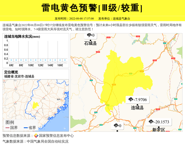 连城县气象台2022年08月08日17时57分继续发布雷电黄色预警信号:预计未来6小时我县部分乡镇有较强雷雨天气,雷雨时局地伴有强雷电、短时强降水、7-9级雷雨大风等强对流天气,请注意防范! 信息来源:国家预警信息发布中心; 发布单位:连城县气象台。