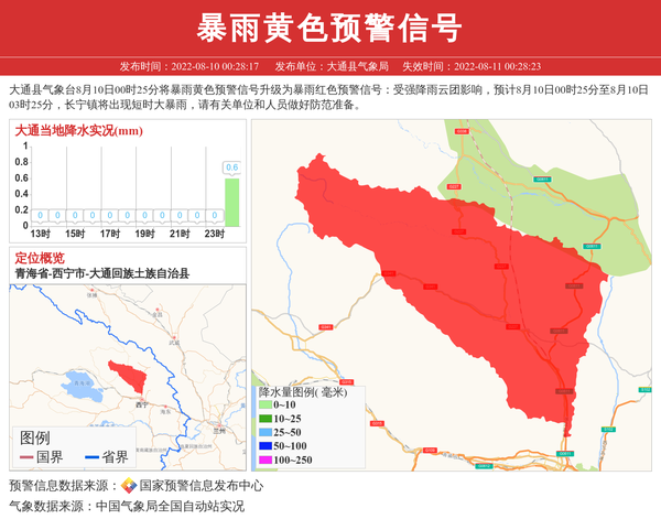 大通县气象台8月10日00时25分将暴雨黄色预警信号升级为暴雨红色预警信号:受强降雨云团影响,预计8月10日00时25分至8月10日03时25分,长宁镇将出现短时大暴雨,请有关单位和人员做好防范准备。 信息来源:国家预警信息发布中心; 发布单位:大通县气象局。