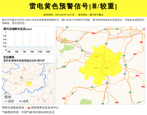 都匀市气象台8月9日14时41分发布雷电黄色预警信号:预计未来3小时我市平浪镇、墨冲镇等地将发生雷电活动,可能会造成雷电灾害事故,请注意防范! 信息来源:国家预警信息发布中心; 发布单位:都匀市气象台。