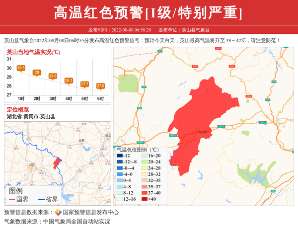 英山县气象台2022年08月08日06时55分发布高温红色预警信号:预计今天白天,英山最高气温将升至 39~42℃,请注意防范! 信息来源:国家预警信息发布中心; 发布单位:英山县气象台。